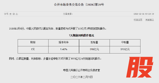 2月6日金融一线消息,央行今日开展315亿元7天逆回购操作,操作利率为1.40%。同时,以固定数量、利率招标、多重价位中标方式开展了3000亿元14天期逆回购操作。因今日有4775亿元7天期逆回购到期,实现净回笼1460亿元。